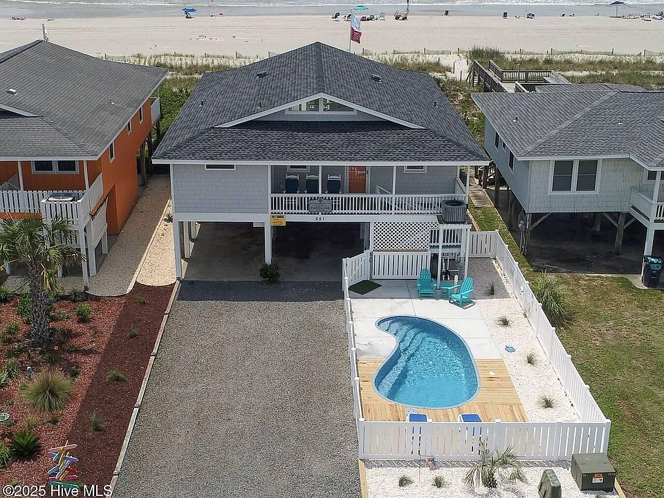 Welcome to your dream coastal getaway in one of the most desirable areas of Holden Beach. This beautifully remodeled 4-bedroom, 3-bathroom oceanfront home combines modern beachy charm with exceptional comfort and functionality—perfect as a private retreat or a high-performing vacation rental. Step outside onto your private oceanfront boardwalk and sink your toes into the sand in seconds, or take in the breathtaking ocean views from your covered beachfront porch, ideal for morning coffee, sunset cocktails, and everything in between. Inside, the open-concept living area flows seamlessly into an updated kitchen featuring granite countertops, stainless steel appliances, and stylish finishes. Most of this home has been thoughtfully upgraded since 2019, from the furnishings to the fixtures, giving it a fresh, modern beach vibe throughout. After a day at the beach, relax in your private saltwater pool, tucked away behind a privacy fence on the street side for maximum seclusion. A second covered porch lets you enjoy the peaceful charm of the neighborhood and salt air breezes.