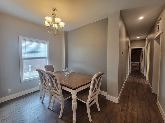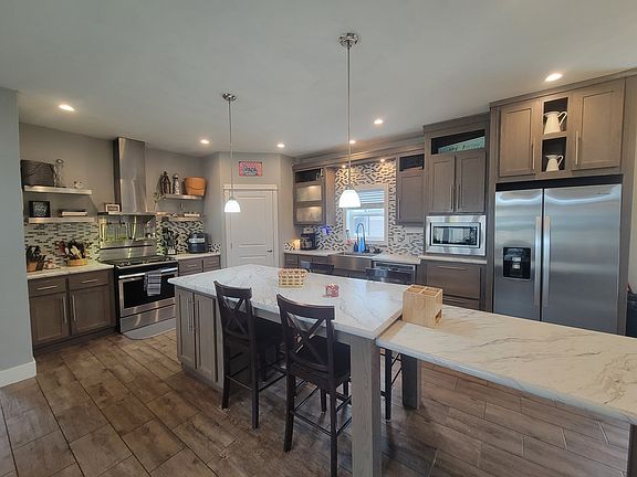 4 bedroom, 2 bathroom home Now Listed. With a great floorplan and multiple upgrades throughout, this is a home you wont want to miss! In the main living room to this home you will notice a large built in accent wall for an oversized TV with an LED fireplace and accent lighting. The two level island separates off the massive kitchen that comes equipped with all stainless steel appliances with vented hood, farmhouse sink, and coffee bar upper cabinet with fogged glass and specialty lighting. The corner pantry and deep drawers in this kitchen also make it nice for extra storage. The primary bedroom is off the main room where you have bright double windows and an attached ensuite featuring a spacious walk-in closet, LED lit mirrors, a dual sink vanity and ceramic tile shower with glass doors. The 3 spare rooms and additional bathroom are down the hallway with one room designed with built in bunkbeds and the laundry room is at the very back of the home. In the laundry room you have an extra bonus area where you can store a deep freezer, work at the built in desk and utilize the utility sink as needed. The back door leads to an 8x10 deck and grass area to entertain guests and there is an 8x10 shed with lawn mower and snow blower included. There is a large driveway, Central AC, gas furnace and gas 40 gallon water heater. Schedule your tour today. 3rd party financing options, conditions and restrictions may apply and we offer equal housing opportunities.