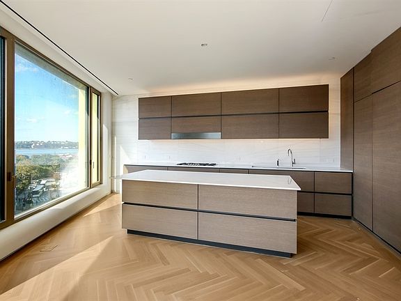 The expansive corner living room, with its oversized windows, fill the space with bright natural light and offer breathtaking views from the southern and western exposures. The eat-in Molteni kitchen is a chef's dream featuring integrated appliances, top-of-the-line craftsmanship, with beveled Blanco de Macael marble countertops and natural oak cabinetry.