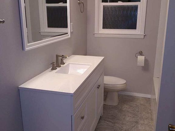 Newly renovated upper duplex with entire bath remodel, large vanity, stylish mirror and modern lighting throughout. Living room and bedrooms have gray walls and carpet, and and window coverings. Vinyl plank flooring in kitchen with new countertops. Stove and fridge recently replaced with stainless steel. Comes with washer and dryer, tons of storage, garage, as well as one driveway parking space. Private patio. Very well kept home with friendly, hands on landlords.