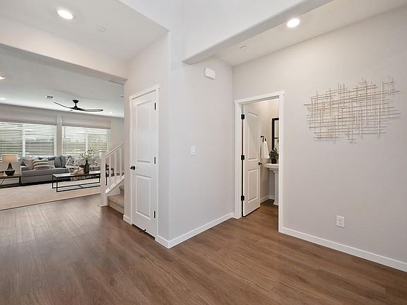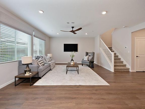 Welcome to this pristine, like-new & move-in ready home in the prestigious, gated Edgelake community. Modern elegance shines with upscale finishes including luxury plank flooring, upgraded carpet, custom window treatments, ceiling fans & stylish fixtures. High ceilings bring in natural light & create a dramatic entry, leading to a flexible den that can easily convert to 4th bedroom. Open concept floor plan highlights a spacious great room, dining area & chef's kitchen with espresso cabinetry, granite slab counter, iridescent tile backsplash, stainless appliances, walk-in pantry & striking iron light fixtures. Upstairs, the luxurious primary suite features spa-inspired finishes including dual sinks, custom mirrors, soaking tub, walk-in shower & large walk-in closet. Two guest bedrooms (one with walk-in closet) a loft/office area, full bath with tub/shower combo & laundry room complete the upper level. Outdoors, enjoy a professionally landscaped yard with custom covered flagstone patio & walkway handcrafted stone bench, & serene lighting. Additional features include an insulated epoxy-floor garage with EV charger, solar & abundant storage. Minutes from shopping & Hwy 50. Pride of ownership exudes making this a MUST SEE!
