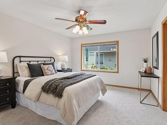Single-level living in the heart of the desirable Kenny neighborhood! This beautiful 3-bedroom, 2-bath home offers a bright, open floor plan with vaulted ceilings, a spacious kitchen, and an inviting living/dining room with a cozy gas fireplace. Fresh paint, new carpet, new range and microwave, and updated fixtures make it move-in ready. The primary suite features a private bath, and main-level laundry adds convenience. A bonus office or den is perfect for work or hobbies. Enjoy the outdoors on the large sunny deck with privacy fence as well a beautiful green space views from the dining room and bedrooms. The attached, large 2-car garage with lots of storage plus HOA-provided lawn care and snow removal means low-maintenance living year-round. Located near Lake Harriet, Minnehaha Creek and Parkway, with easy access to shopping, dining, and recreation, this home is ideal for those seeking a carefree lifestyle in a friendly, walkable community.