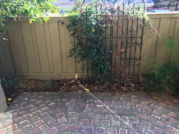 This renovated 2 bedroom, single bath single story, downstairs townhome has extraordinary amenities...consider wood burning fireplace for cozy evenings, central air conditioning for toasty summer days, a beautifully designed outdoor patio/garden area featuring a lot of sunshine and an enclosed storage area. Living area is hardwoods, master bedroom is carpeted. Includes full sized washer and dryer and frig. Kitchen features large breakfast bar, pantry and smooth top range. Closet doors are mirrored and bath features super sized counter and dual entry. Carport is just steps to the front door. Extra parking available adjacent to the unit. Also included is security system with camera and electronic front door lock.