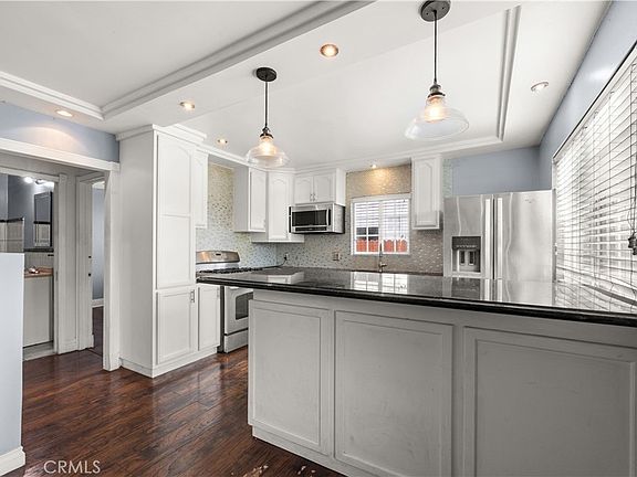 Inside the front house, you’ll immediately notice a spacious living room area with an open concept kitchen that comes equipped with stainless steel appliances, decorative backsplash, & granite countertops. There’s hardwood flooring, recessed lighting, and double pane windows throughout.