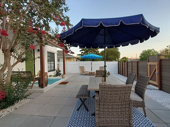 Enjoy the large private front and back yards, perfect for relaxing or dining outdoors. Patio furniture create a cozy and unique atmosphere.