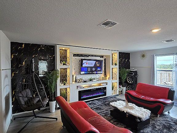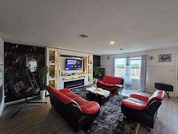 This home offers comfort. As you enter, you'll be greeted by an inviting foyer that leads to an expansive living room with a decorated design build 85" TV Media wall with LED lights and fire place.