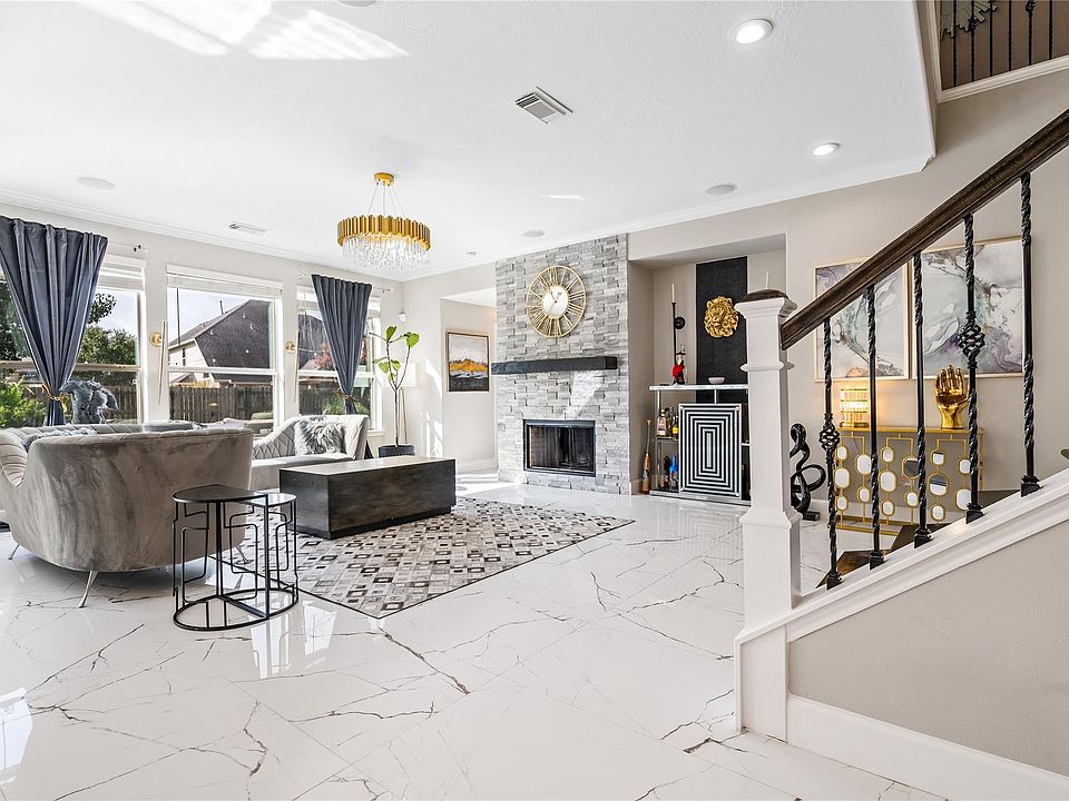 Inside, enjoy the airy open layout with luxury flooring, fresh designer paint, and updated fixtures. The chef’s kitchen features quartz countertops, stainless steel appliances, and plenty of space for gatherings. Upstairs, a large game room is perfect for movie nights, play, or a home office. The serene primary suite offers a spa-like bath with a soaking tub, double vanities, and a walk-in closet.