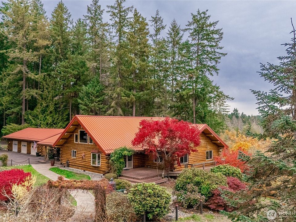 Meander through towering firs and cedars to this breathtaking 2,903+/- sq ft log lodge on 5+/- private acres off Johnson Point, showcasing a majestic Mt. Rainier view. Enjoy the feeling of living in the wilderness while still being close to town. The expansive great room pairs beautifully with a huge chef’s kitchen, ideal for entertaining. A split-bedroom plan ensures privacy, while outdoors offers multiple decks, two firepits, a charming cabin perfect for guests or crafting, and open fields for livestock. Durable metal roof, propane or wood-powered radiant heat, and an oversized 3-car garage complete this rare retreat blending seclusion with modern convenience.