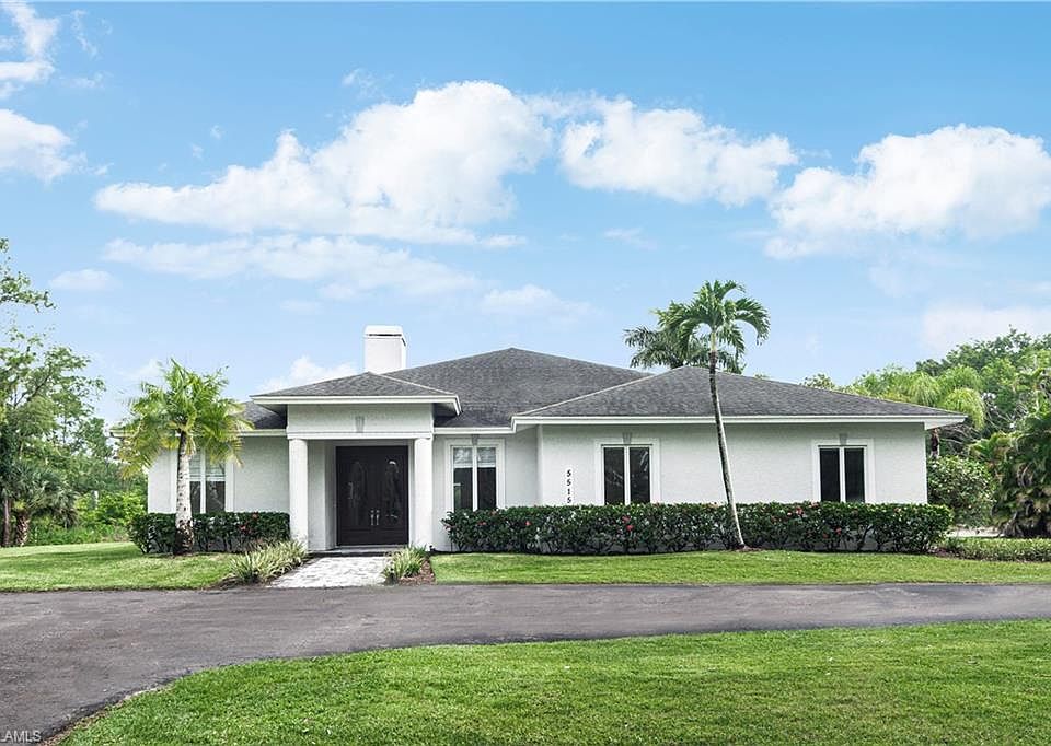 This 2,979 sq.ft. under air estate home sits on 2.28 acres just North of Pine Ridge Rd and minutes from I-75. The property is located in one of Naples' top school districts and offers easy access to shopping and dining. Completely remodeled in 2019 with upgraded finishes throughout: shiplap and board and batten trim details, quartz countertops, freestanding tub, custom marble mosaic detail at master shower and much more. It offers four bedrooms, three bathrooms, office, fireplace, attached oversized two car garage, plus a separate single car garage and a 700 sq.ft. covered rear lanais patio with resort style pool and cage. The backyard features two separate air conditioned studio/hobby buildings on a separate electrical service and sewer hook-ups for a motorhome or future bathroom. The 12 zones of irrigation lends itself to plush landscaping throughout the property, including brick paver walkways in the backyard leading to the two outbuildings and a fire pit. Additionally there is a landscaped KOI pond with water feature at the front of the property. This is the perfect "move-in" ready home for enjoying time with friends and family both inside and out.