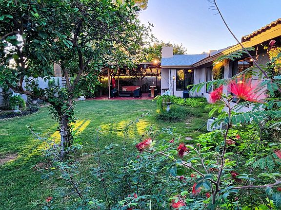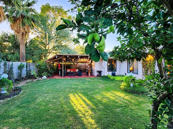 Beautiful brick fireplaceNew paintPeaceful water fountainDesert landscapingLarge covered patioFresh sodBright lush green backyard