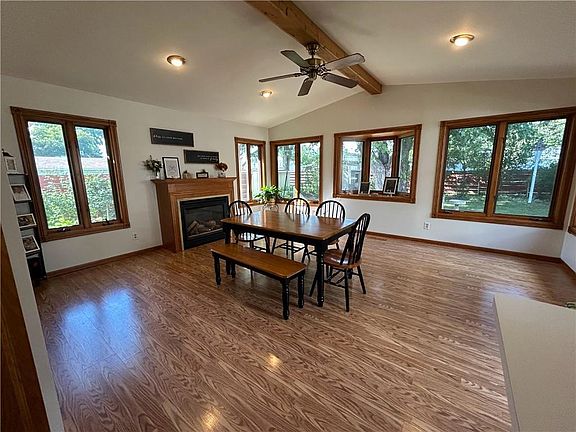 Beautiful 4-bedroom, 2-bath ranch in a fantastic location with great features! Exterior includes concrete driveway, double garage, architectural shingles, bay window, deck, patio, and landscaped yard. Inside offers an updated kitchen with newer appliances, laminate floors, cozy dining area, and open layout to a spacious back family room. The vaulted family room boasts recessed lighting, ceiling fan, abundant windows, bay window, gas fireplace, and access to the fenced backyard with great views. The front living room features a bay window, carpet, flat ceilings, and direct deck access. Main floor includes a remodeled bath with shower window and single vanity, plus three carpeted bedrooms with paneled doors and closets. Large 3-season porch off garage with great potential. Lower level offers another family room, laundry, and oversized bath. Across from Simon Lyberg Park and blocks from Halmstead School!