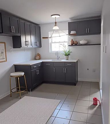 - Renovated kitchen with sleek cabinetry, ample storage, and counter space