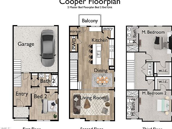 Spacious 3 - bedroom, 3 story end-unit townhome with plenty of natural light. The open floor plan on the second level creates an easy flow between the kitchen, dining and living areas - perfect for both everyday living and entertaining. One bedroom is located on the main level with its own bath and closet. The second floor showcases dual primary suites, each with walk-in-closets and private baths, providing comfort and privacy. A two-car garage provides convenience and extra storage. As an end unit, this home enjoys added privacy. Convenient location in Knightdale close to major routes and very close to shopping.