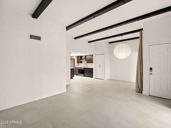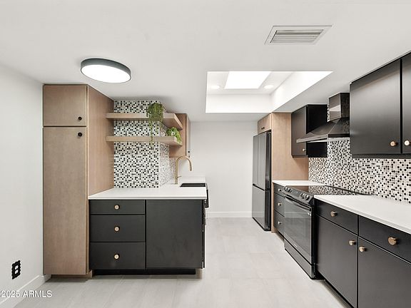 STYLISH. MODERN. LOCK & LEAVE. This fully renovated University Shadows gem blends modern elegance with comfort and designer finishes throughout. Inside, you'll find vaulted ceilings with beams that frame the spacious living area, leading to a show-stopping kitchen with slab-front cabinets, mosaic backsplash, and a gorgeous black farmhouse sink. You don't want to miss the bathrooms! Both are works of art — one with a striking black-and-white tile shower, marble countertop & gold accents, and the other with a custom vanity, illuminated mirror, and spa-inspired walk-in shower. The private turf patio is perfect for pets! Major updates include new windows, sliders, HVAC, and water heater. HOA covers the roof. Prime location near Tempe Marketplace, Mesa Riverview, Sloan Park, and Cubs Stadium, just minutes to Scottsdale and a quick drive to downtown Phoenix. Lovingly renovated by the owner with no expense spared.