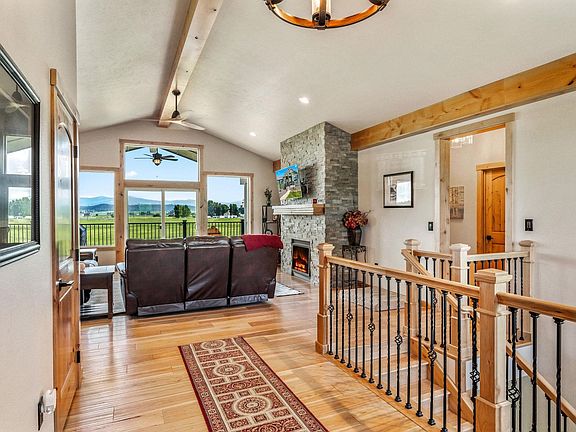 This stunning property boasts 10 acres of land and was built in 2021. With 5 bedrooms and 3.5 bathrooms, it offers beautiful hardwood floors, vaulted ceilings, beautiful brick gas fireplace and large windows to fill the space with natural light. The kitchen has granite countertops, custom backsplash, built-in double oven/microwave, gas stove, and a farmhouse sink. Just down the hall is the master bedroom with a walk-in closet and an ensuite bathroom with double undermount sinks, a double shower head, tile floors, and a soaking tub. The other 2 bedrooms are on the opposite side of the house with another full bath. Downstairs is your spacious walk-out basement, with huge windows, a kitchenette, 2 bedrooms, 1 bathroom, and a large 1200 sq ft storage area wired for a sauna. The back patio is a perfect spot to relax after the sauna, featuring a concrete slab with power connections and a hot tub. There is a fenced garden area, small dog run, and fruit trees. This property is a true gem!