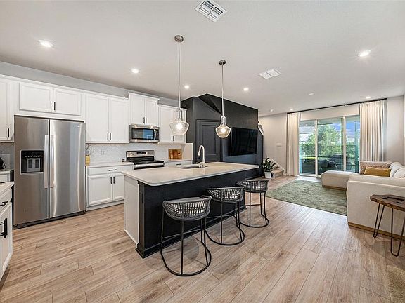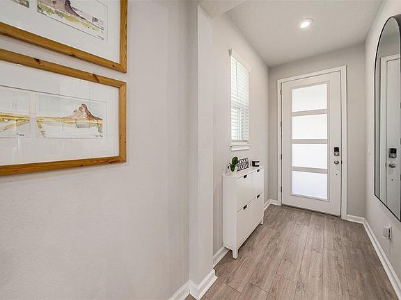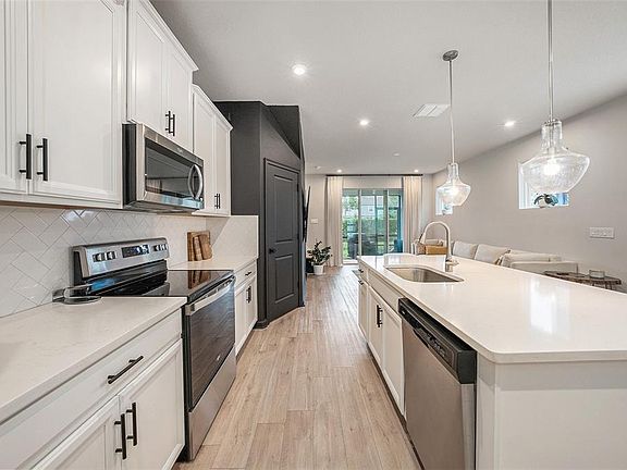 This desirable CORNER UNIT “Marianna” townhome with no rear neighbors offers exceptional privacy, abundant natural light, and 1,680 square feet of stylish living. The popular Modern elevation gives the exterior a sleek, contemporary curb appeal, while inside, designer-selected finishes create a truly move-in ready home with an open and spacious layout. The kitchen shines with upgraded cabinetry, quartz countertops, and an impressive walk-in pantry—perfect for entertaining or everyday living. Luxury vinyl plank flooring flows throughout the first level, enhancing both beauty and durability. Upstairs, you’ll find a versatile loft space, three bedrooms, and two full baths. Each bedroom, including the secondary rooms, features walk-in closets for exceptional storage. The owner’s suite is a private retreat with three spacious walk-in closets and spa-like bath. Additional highlights include a screened lanai for outdoor living, a one-car oversized garage with a two-car paver driveway and professionally installed garage ceiling storage, and a smart home package with an Ecobee thermostat, video doorbell, and touchscreen panel. Located just minutes from Publix, Home Depot, The Grove, Wiregrass, and Tampa Premium Outlets, this community also features top-rated schools and exceptional amenities—including a clubhouse and fitness center, pickleball courts, playground, dog park, and a resort-style pool with lazy river.