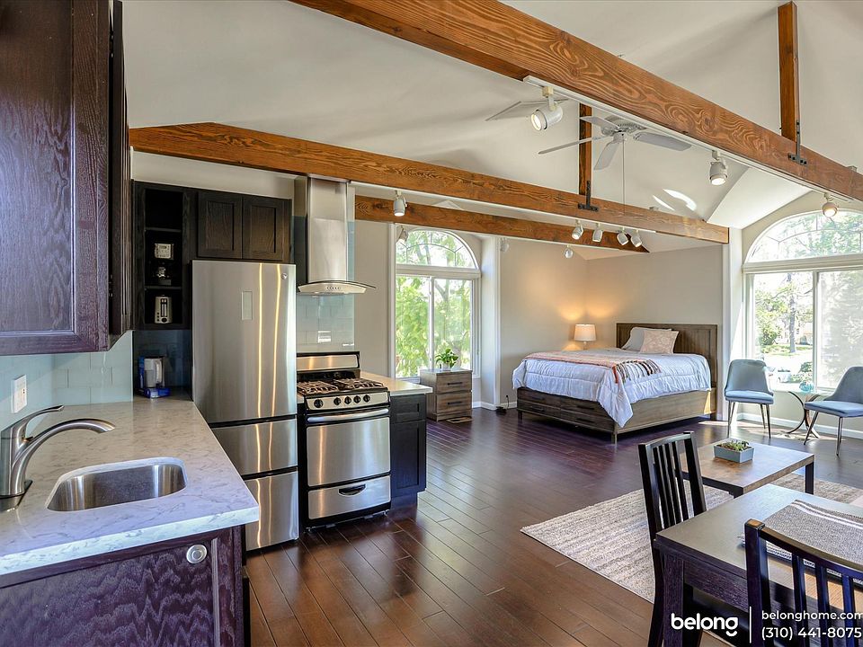 An open floor plan and exposed beam ceiling make the well-designed interiors of Unit B, 5521 Columbus Avenue stand out! Found in the warm community of Sherman Oaks, this studio home is finished in hardwood and comes with plenty of oversized windows that provide great air ventilation and abundant light. The modern kitchen is built-in and comes with stainless steel appliances including a 4-burner gas stove and range, a garbage disposal sink, and a fridge. A full bathroom with a glass-enclosed shower stall features a rain shower making bath time a relaxing experience! A pocket balcony that has views of trees that change colors throughout the year is the ideal setting for morning coffee. This home is feline-friendly and comes partially furnished. Laundry machines found in the garage is also available for use. This home is very near the Kester Elementary School and has superb access to the 101, 405, and various bus stops. Target, Bevmo, and Petco can also be reached on foot. For leisure and entertainment, this home is a brief drive from Castle Park, Ventura Blvd. and Sherman Oaks Galleria with Arclight Theater. Bike trails, parks, The Japanese Garden and Wildlife Reserve are also quick options when one wants to commune with nature. Welcome to a new kind of rental experience. Welcome to Belong. We are here to make sure you love your new home. To apply for this home and schedule tours, please visit our website! CA DRE License #02082345 Utilities included in rent: water, gas, electricity, garbage & recycling, sewage, parking. Additional person adds $100/mo. to cover utility costs.