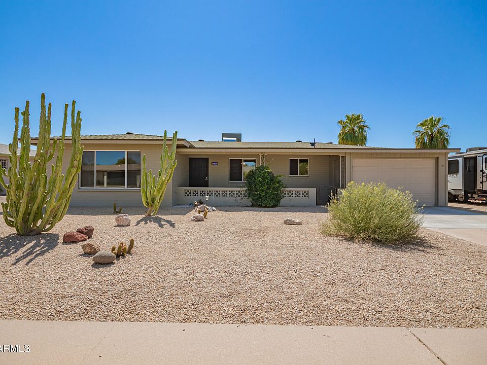Explore this tastefully updated 2-bed, 2-bath residence in the 55+ Dreamland Villa! Displaying a practical garage, a desert front yard, & front porch. The inviting interior features fresh neutral paint, abundant natural light, and tile floors for easy maintenance. The large living room is perfect for receiving guests! Enjoy delicious meals in the eat-in kitchen, equipped with granite counters, wood shaker cabinets, recessed lighting, a tile backsplash, and essential built-in appliances. The main bedroom boasts double built-in closets and a private bathroom for added comfort. The secondary bedroom has access to the versatile bonus room, offering additional living space to fit your lifestyle! Relax in the backyard, complete with a covered patio, dog run, & two storage sheds. Move-in ready!