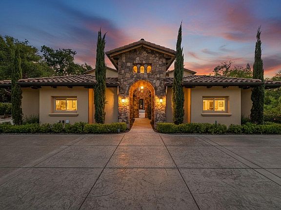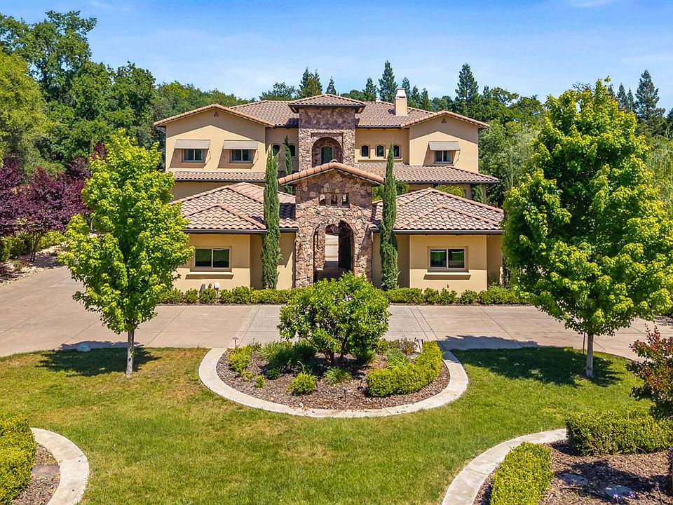 Set on a private acre in an exclusive enclave, this custom estate combines timeless elegance with modern amenities. Just minutes from premier shopping, dining, and top schools, it delivers both seclusion and convenience. A dramatic entry with soaring 24-foot ceilings opens to six spacious en-suite bedrooms, highlighted by intricate crown molding, wrought iron accents, and four fireplaces throughout the home. The gourmet kitchen features Viking appliances, dual dishwashers, and flows seamlessly into expansive living areas with a custom wet bar ideal for entertaining. Designed for today's lifestyle, the home includes ceiling fans in every room, individual tankless water heaters, an EV charger, and owned solar for minimal energy costs. Outdoors, enjoy resort-style living with lush landscaping, stamped concrete, covered patios with misters, and RV parking. Rarely offered, three detached two-car garages (six total) include one pre-plumbed for a future ADU.