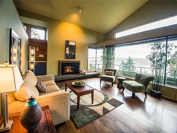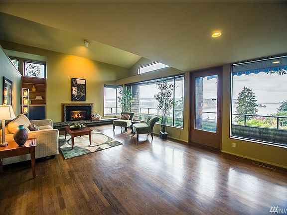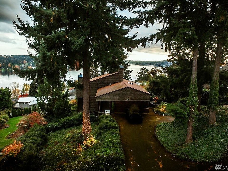 True level entry with views of Lk Washington thru a wall of windows greets you.This mid century modern home boasts handsome hard woods gleaming by fireside throughout the living/dining room.Main level bedroom and full bath.Upstairs is an open concept master en suite with Juliet balcony.The lower level hosts a second fireplace in the family room with 2 additional bedrooms, laundry room, full bath.The in ground pool is surrounded by a large deck,lush landscaping and fully fenced.