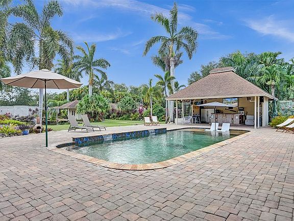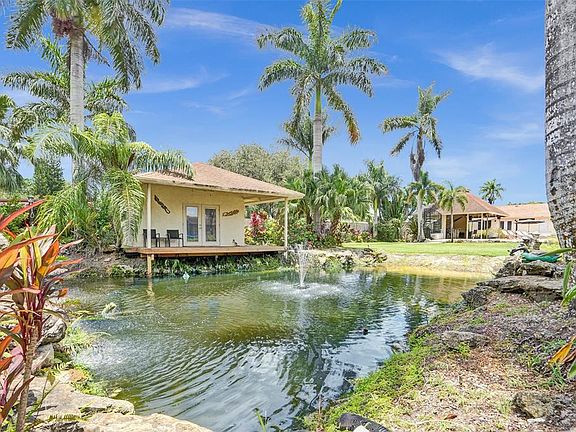 Rare opportunity in the Green Meadows neighborhood of prestigious Southwest Ranches. This sprawling L-shape ranch estate situated on 1.13 acres offers endless opportunities for growth and privacy. This is an outstanding option for contractors, creatives or anyone seeking that work from home lifestyle or expansive multigenerational living. The main house features 5 large bedrooms, 5 full baths and 3 half. Countless options abound with 2 additional buildings, creating guest room, office or workshop. Enjoy a heated pool and gorgeous tropical sunsets steps from 1 of 2 primary suites or stroll further west to feed the fish in the “Koi pond”. The entirety of the estate is securely fenced. A 2nd hard surface driveway leads to a 20x40 workshop with ample parking for trucks, trailers, RVs, etc.