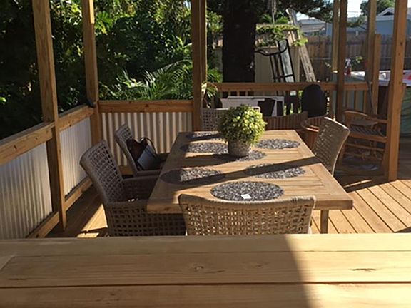 Outdoor living space has electrical outlets are nearby for charging your phones, electronics or working on your laptop. At night the area comes alive with solar lights.