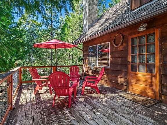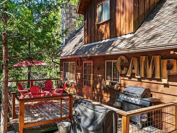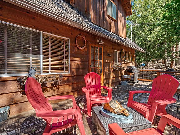 Idyll-Camp, A rustic retreat with modern day amenities set back from the street on a beautiful wooded lot backing up to a seasonal creek. Charming cabin with loads of character throughout. Features include a main floor primary suite complete with a gorgeous tiled bath/shower combo & groovy retro wallpaper, Remodeled kitchen with stainless steel appliances, wood counter-tops, artistic backsplash & unique corner sink overlooking the front deck, perfect for Al Fresco dining! A combo Dining & Living room complete with wood-burning stove, rustic wood beamed ceiling, & warm wood flooring. Upstairs features 2 guest rooms with a shared Full bath. The basement level could be a separate apartment as it features a wet bar/kitchenette, sleeping area (possible 4th bedroom), 2nd living room w/pellet stove, laundry room & work space, half bath & outdoor shower area. A magical wooded setting with a spectacular Fern Valley location, close to the Village of Idyllwild featuring fine eateries, art galleries, & unique one-of-a-kind shops. Paradise can be yours if you act quickly. Priced to sell!