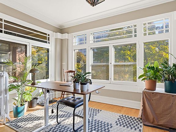 Chicago Glam calls this property home! Spacious and well laid out, natural light throughout, refinished hardwood floors, and lovingly renovated 3 bed/2 bath home in East Hyde Park. This home features over 1700sf of living space, plus a private back porch, and access to an enclosed private backyard. Sunny and large living room, vintage details include floor-to-ceiling built-in shelving flanking a decorative fireplace, and a south-east-facing sunroom which looks out over a quiet tree-lined street. The bedrooms are generous in size, each with a walk-in closet, dramatic yet cozy; the third bedroom is off the kitchen and serves perfectly as a guest room/home office. The separate dining room has space for all your entertainment needs - large dining table, bar, buffet, club chairs, etc. The kitchen has 42" newly painted cabinets with quartz countertops and extra depth for the upper cabinets, all new SS appliances, updated flooring, walk-in pantry, and a kitchen table with bench seating and built-in storage. In-unit combo washer/dryer. The property has ample storage - walk-in closets in each bedroom, 2 large closets in foyer/hallway - plus a large storage room in the basement. This 6-unit, well-maintained boutique building is professionally managed, has an exercise room, bike storage, and additional open space in the basement. The home is just steps from everything Hyde Park has to offer - our world-class lakefront, University of Chicago, CTA, and quick access to LSD and 90/94, a variety of restaurants, shopping, the Museum of Science and Industry, and the beautiful Jackson Park District. No investor rentals.