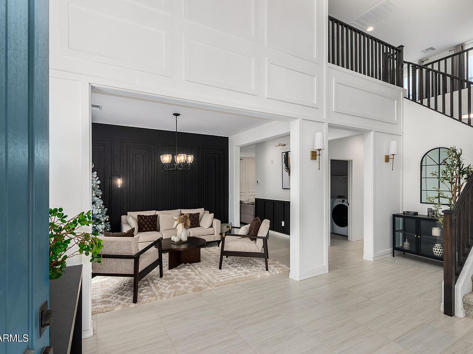 This UNIQUE home has it ALL! You will love the contemporary custom fixtures and finishes including custom wainscoting throughout. As you walk in, you willl be greated a stunning 20' foyer, impeccable wall paneling & chandelier. BEDROOM and FULL BATH on the 1ST floor as well as a front gathering room that can be used as an office or additional living room. You will love the open concept gourmet kitchen with brushed flannel quartz countertops, waterfall island, eased polished edges, shaker cabinets with custom lighting under the cabinets & chevron polished mosaic backsplash. Energy-efficient GE appliances-convection/air frier, GAS cooktop with a hood. Samsung refrigerator and walk-in pantry. In the living room you will find a custom built TV wall, fireplace & floating shelves/wall paneling with recessed can lighting. Charcoal maple ebony stair railing leads you to the inviting primary bedroom which features a spacious walk in closet , sliding shower, dual vanity & 12 light chandelier. 3 generous size bedrooms with walk-in closets and loft upstairs. North-facing spacious yard featuring a covered patio, artificial grass and pavers, automatic timed drip irrigation & solar powered ground lighting. Perfect location just a few minutes from the neighborhood school, shopping and highway 202.