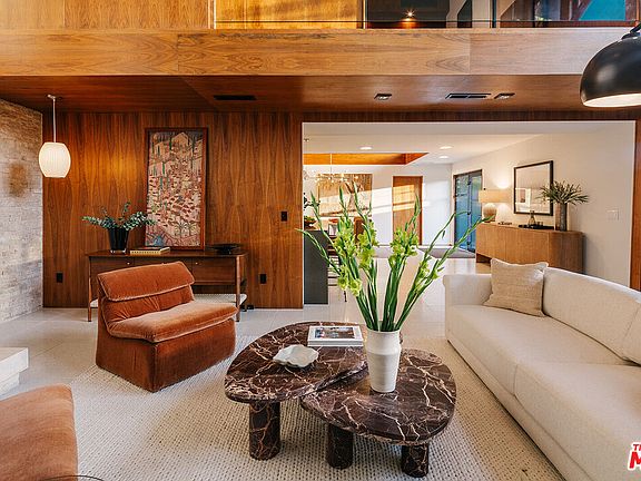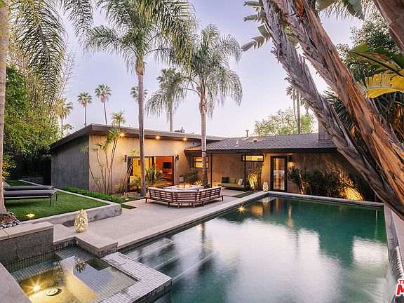 Welcome to this reimagined 1960s mid-century modern gem in the prestigious Oaks. This 3-bed, 3.5-bath home is rich in architectural detail, featuring custom walnut paneling, terrazzo, and freshly refinished hardwood floors. The open-concept kitchen offers sleek Italian cabinetry and premium appliances. A dramatic two-story living room, with a gas fireplace and abundant natural light, creates a loft-like atmosphere. A floating staircase leads to three bedrooms, three bathrooms, and a dedicated office area with a custom built-in desk. Step outside to a Zen-inspired backyard oasis accessible from the upper level. The spacious primary suite is a true retreat with a built-in king bed, integrated wardrobes, and a private patio with a tranquil fountain perfect for morning coffee and meditation. The backyard is an entertainer's paradise with a UV-filtered pool/spa, fire pit, and upper gazebo offering panoramic sunset views. Extras include Lutron lighting, automated shades, central vacuum, newer pool equipment, and an owned solar system with two backup batteries covering the entire electric bill. Sophisticated design and ultimate privacy in one of L.A.'s most coveted neighborhoods.