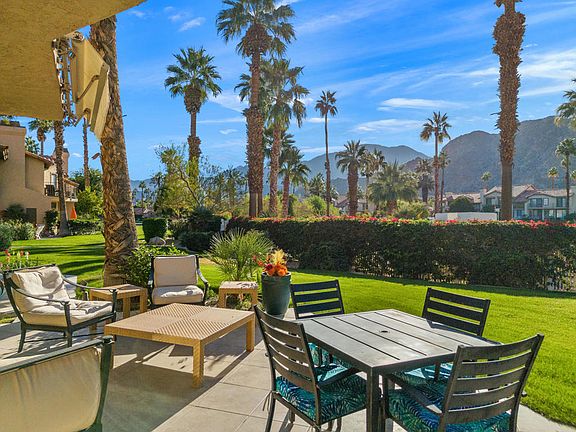 Discover the epitome of luxury in this turnkey furnished townhouse at PGA West, a premier golf & active lifestyle community. Perfect for a lock-and-leave lifestyle, it boasts stunning southwest views of a serene lake & majestic mountains. This modern home features an easy-to-maintain layout with 18x18 diagonal ceramic tile floors, updated lighting, plantation shutters, & a spacious kitchen. Each bright room has exceptional views. The back patio, outfitted with a retractable awning, opens to a scenic view featuring rolling lawns, a tranquil lake, & soothing waterfalls. It's adjacent to one of many community pools & spas. The property includes two upstairs bedrooms, each with its own private balcony, ideal for relishing the warm, picturesque sunsets. Recent appliance upgrades, a detached double car garage, & proximity to PGA West's world-class golf courses are highlights. As a PGA West member, enjoy close access to tennis, pickleball, fitness facilities, & dining options. La Quinta residents also benefit from golf discounts at SilverRock Resort. The HOA covers essentials like cable TV, internet, exterior maintenance, landscaping, pest control, trash, & security, making this home an ideal for an active lifestyle, with easy access to golf, biking, hiking, & other outdoor activities.