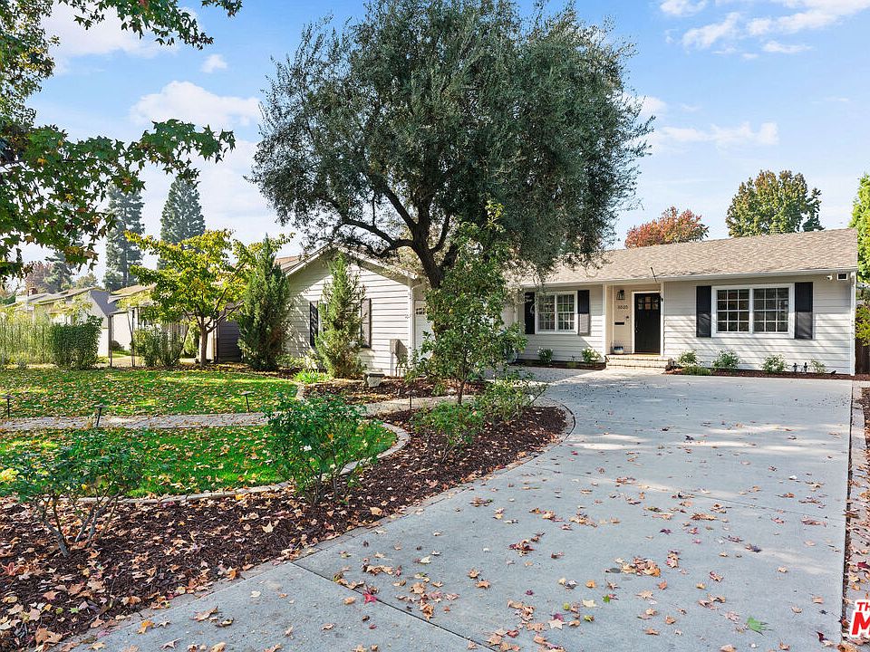 This storybook Chandler Estates residence embodies timeless California living with its graceful charm, quality craftsmanship, and modern comfort. Set on a beautifully landscaped 9,600 square foot lot with over seventy feet of frontage, it is framed by mature trees and a lush front garden that create a sense of privacy and warmth from the moment you arrive. Inside, the single-level floor plan offers effortless flow from the chef's kitchen to the dining and living areas, all filled with natural light and thoughtful design. The kitchen is a true centerpiece with custom cabinetry, quartz countertops, and premium appliances including a Wolf range, Bosch dishwasher, and LG refrigerator, ideal for both everyday use and entertaining. The primary suite serves as a peaceful retreat with a spa-inspired bath featuring dual vanities, a soaking tub, a frameless glass shower, and a generous walk-in closet. Two additional bathrooms have been elegantly updated with designer finishes. Interior highlights include crown molding, recessed lighting, fresh designer paint, and dual-pane Pella windows that bring in the beauty of the outdoors. Sliding doors open to a private backyard oasis with a deck off the dining room, a sparkling saltwater pool, and a spacious grassy yard surrounded by mature landscaping and blooming gardens. Thoughtful upgrades include owned solar, a newer roof, updated electrical systems, a replaced sewer line and main tie-in, two tankless water heaters, and central heating and air conditioning. With a two-car garage and extended driveway parking, this home sits proudly on one of the most picturesque, tree-lined streets in Chandler Estates, offering a rare blend of character, comfort, and sophistication.