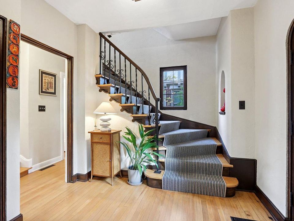 Charming curb appeal and fantastic location make this stunning Tudor a must-see! Its classic design has lovely brick, stone, and ''half-timber'' wood trim. The welcoming front porch features a unique stone crest above the entry door. Inside find an expansive bright LR w/GFP and coveted plaster crown molding, Step up through columned arches to the dining/family room w/BICCs. Look out to the deck and fenced backyard from the updated kitchen w/granite counters, Shaker-style cabinets, and SS appls. Pantry closet and powder room complete the main. The curved staircase leads to 2nd floor Primary Suite w/2 closets and updated BA with walk-in shower & tub. Also on upper are 2nd & 3rd BRs and full BA w/SOT. HWFs throughout. LL rec rm w/built-ins, office, 1/2 BA, laundry. 2-car GA & 4+ add'l prkg!