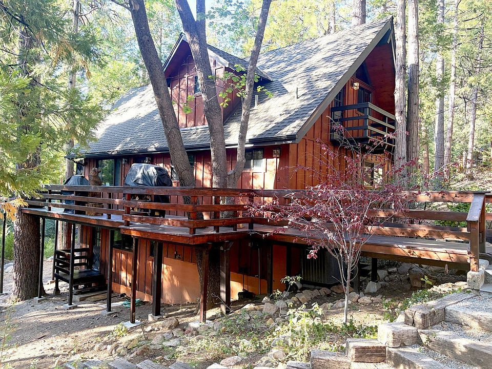 Beautiful, Spacious Idyllwild Retreat: This home was luxuriously updated in 2016 with over $200k in upgrades--truly a masterpiece. Enter into a large great room with 22-foot vaulted ceilings, stone fireplace, and huge windows that look out onto the intimate forest setting. The large, wrapping, elevated deck provides endless opportunities for indoor/outdoor living. The fully remodeled kitchen and eat-in bar are off the great room, making entertaining a breeze. Notably, each bedroom suite is on its own floor. The huge downstairs en-suite master is plush with a slate stone fireplace, grand bath and shower, and large walk-in closet. One guest bedroom/bathroom are on the main level, with the third bedroom/bathroom upstairs, making a fantastic floor plan for family and friends. Upgrades include: 5-ton Rheem heater/AC, new duct work, Idaho quartzite flooring, Calcutta countertops, new faucets, sinks, toilets and valves, new insulation, porcelain tile, LG black appliances, new cabinets, new insulation, new propane tank and gas lines, Ring cameras, alarm, thermostat, smart water valve, new luxury carpets, new 200 amp panel w/60 amp garage sub-panel for Tesla wall charger. The driveway resurfaced in 2023.