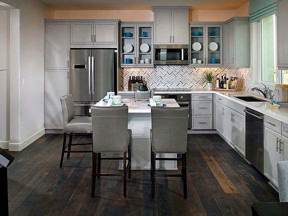 Freshly Updated Models ; Open by Appointment The Residence Five is a three-story townhome with two-car garage that offers a welcoming entry with a convenient drop zone area ideal for storing keys, purses and more. A separate first floor bedroom with private bath is perfect for guests, an older child or extended family. The second floor features an open layout of the dining, kitchen and Great Room to maximize space and efficiency. The top floor features a spacious secondary bedroom and expansive owner's suite that boasts dual walk-in closets, separate sinks, an oversized shower with built-in seat, an oval soaking tub and dual walk-in closets.