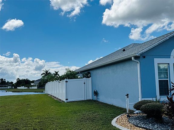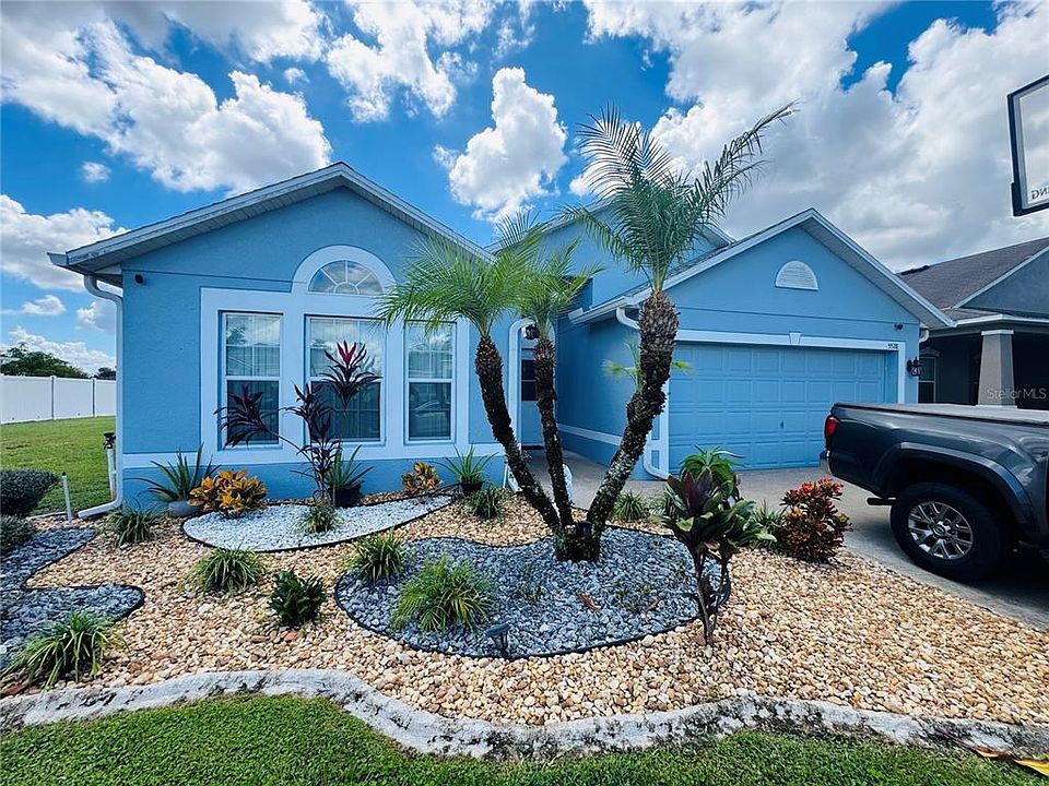 This single-family home offers a landscaped front exterior and includes 4 bedrooms and 2 bathrooms. Upon entry, there is a spacious foyer and a living room that connects to a family room suitable for gatherings. The eat-in kitchen provides ample cabinet space and granite countertops. An enclosed lanai overlooks the pond. The yard is fenced and contains several fruit trees. The AC unit was replaced in 2015, water heater in 2020, and the roof was installed in September 2025. The property is accessible to John Young Parkway, 192, and is located near Disney Theme Parks, colleges, restaurants, and shopping areas.