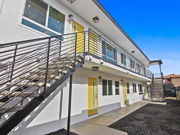 Fresh, modern exterior with secured entry and charming yellow accent doors