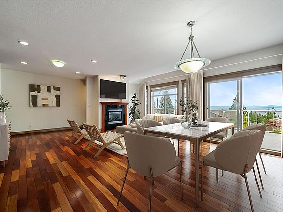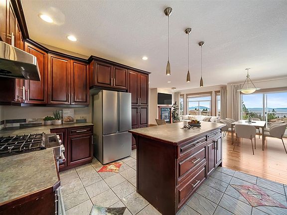 Ocean viewsOpen-concept kitchenUnique tile workLarge picture windowsCozy gas fireplaceWalk-in closetFresh interior renovations