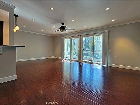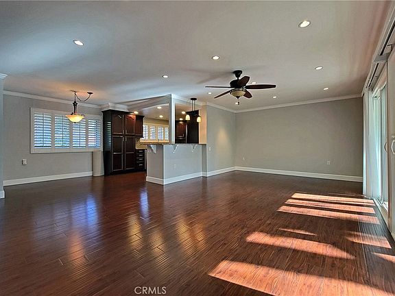 The spacious living area features an open floor plan with smooth ceilings, recessed lighting, crown molding, plantation shutters, and a ceiling fan — perfect for both comfort and style. The modern kitchen boasts granite countertops, stainless steel appliances, recessed lighting, and ample dark wood cabinets.