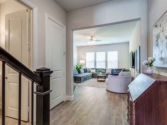 This stunning townhome stands out from the rest as you will see the minute you open the front door. It's so welcoming and feels like home! The beautiful neutral tile runs throughout the main areas so it's easy to keep clean. The first living room is spacious with a lot of light and it joins a beautiful kitchen with the same tile, white shaker-style cabinets, all stainless steel appliances, and a generously sized pantry. You can access the 2-car garage from here. Back in the entry, you'll go upstairs where you'll find ANOTHER living area. Now this one is open so it could be a play loft, TV room or set up your own library here. It's a very flexible space. Straight ahead you'll find the huge primary bedroom with lots of natural light and a sitting area. The ensuite bath features separate vanities and a very big shower. Down the hall are two other oversized secondary bedrooms and another full bath with a tub-shower combination. The laundry room is also on this floor. Outside you will find a lovely front landscaped front yard and a bigger-than-usual fenced backyard with a special feature. Open the gate and there's a paved walking trail and tons of trees! Perfect for your morning stroll after your coffee on the covered patio. One of the best things about this neighborhood is the fabulous location. Two minutes to Main St. with Walmart,Sams and all the other shopping. It's only 1 mile to a hospital, 3 and a half miles to Eagle Point Marina and Lake Lewisville and the same to Lake Park Golf Course.A HUGE plus to townhome living is that outside maintenance is taken care of for you! So come check out this lovely home before someone else steals it!