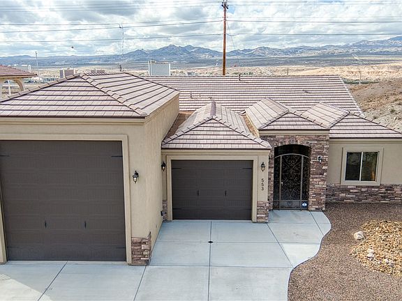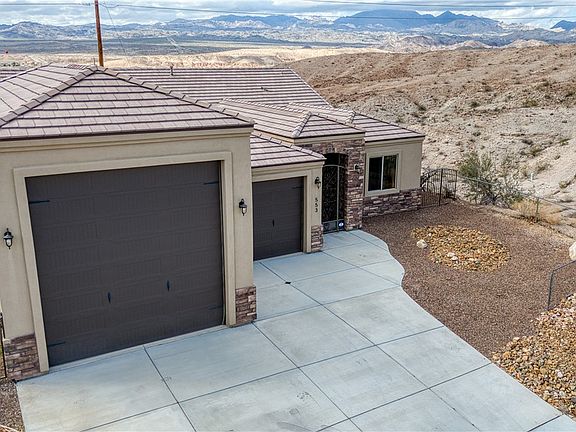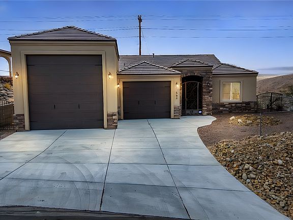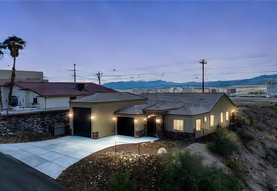 Welcome to Lake Mohave Highlands! Absolutely breathtaking unobstucted panoramic views of the casinos, mountains and river! Move in ready home that is immaculate inside and out boasts statley brick accent exterior with tile roofing! The home features a 2 car garage and an RV garage with water, power and 2 RV dumps inside. Super clean interior features an open spacious floor plan with vaulted ceilings recessed lighting, tile flooring, granite counters, island breakfast bar, stainless steel appliances including a gas stove and dishwasher. Also, home has a large pantry and casual dining area! There are 3 bedrooms and 2 bathrooms. The main bathroom is spectacular with a large dual sink vanity and a separate jetted tub/ walk in shower! The main bedroom also features a HUGE walk in closet! Enjoy living at it's finest! Relax on the rear covered patio and enjoy taking in the amazing views! Call your Realtor today!