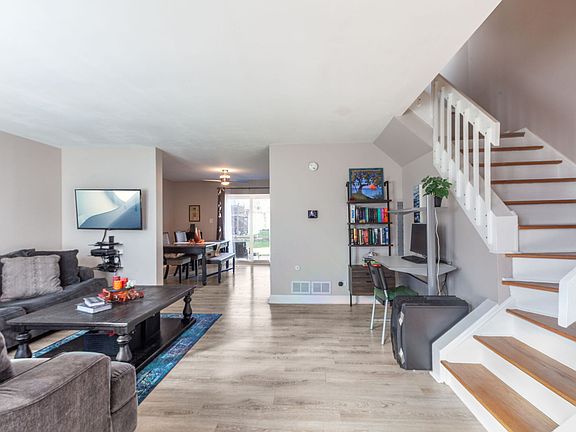 Welcome to this bright, spacious two-story townhome offering comfort and style in a prime location. Enjoy a private entrance and low-maintenance laminate flooring throughout, creating a warm and inviting feel. The full, freshly painted finished basement provides additional living space and ample storage. The main level features a spacious living room and a convenient powder room, perfect for guests. The kitchen boasts 42" cabinetry, room for a center island, and an open layout to the dining area-ideal for everyday living and entertaining. Off the dining room are patio doors to a private patio overlooking peaceful green space, perfect for relaxing or dining outdoors. Upstairs, you'll find two generously sized bedrooms and a shared full bath. Recent improvements: New refrigerator, dishwasher, kitchen sink and faucet, reverse osmosis system, tile backsplash, cabinet pulls, upstairs bathroom faucet all in 2024. Additional highlights include a high-efficiency furnace and A/C, low association dues, and an unbeatable location close to Schaumburg's Town Square, parks, library, shopping, dining, entertainment, Metra, and major expressways. Located in the highly rated Schaumburg High School District.