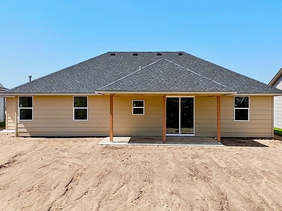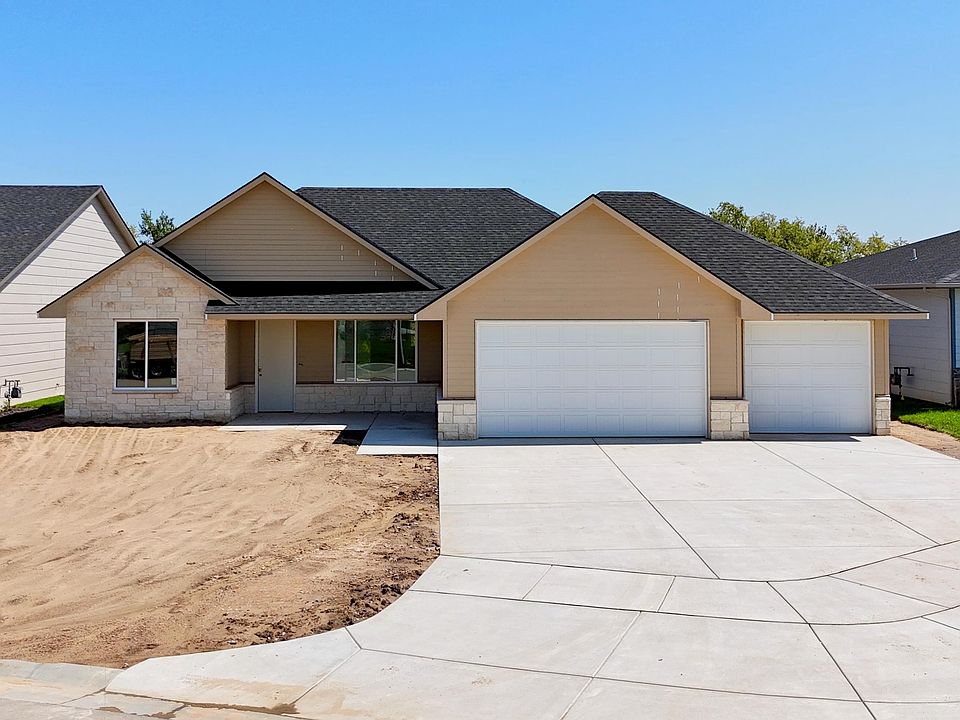 Introducing The Villa Plan by Relph Construction – a home designed for accessibility, comfort, and affordability without sacrificing style. The timeless exterior features natural stone accents and a welcoming covered front porch. Nestled on a wooded lot with no rear neighbors, this home offers both privacy and peaceful views. Inside, enjoy LVP flooring throughout, a spacious living room with flat beamed ceilings, and an electric fireplace. The well-appointed kitchen boasts quartz countertops, a walk-in pantry, and abundant cabinetry, flowing into a separate dining area with doors to the large covered patio—ideal for entertaining. The luxurious master suite includes a large bedroom, walk-in closet, and private bath with dual vanities and tile shower. Thoughtful touches include a separate laundry room with built-in utility cabinet and folding table, plus a generous drop zone at the garage entrance. Two additional bedrooms and a full bath complete the plan. Sod, sprinkler system, and irrigation well included. Finished interior pictures are from when this home was previously built as a spec home and exact finishes will vary. If you hurry, you can still make almost all of your own selections! Some information may be estimated and is not guaranteed. Please verify schools with USD 262.