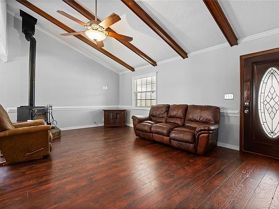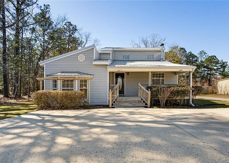Metal Roof Installed after Hurricane Sally in approximately 2021! Situated on approximately 0.69 acres, this charming home offers ample space inside and out, including a large detached two-car garage (32.3' x 24.4', approximately 788 sq. ft.) and a spacious shed (23.5' x 16', approximately 376 sq. ft.). Step onto the inviting covered front porch and into the welcoming living room, featuring soaring ceilings, a wood-burning fireplace, and abundant natural light. The open-concept design flows seamlessly into the kitchen, which boasts generous countertop space, ample cabinetry, a built-in oven and microwave, an island with an electric cooktop, and an overhead pot rack. Adjacent to the kitchen, the dining area provides access to the covered back porch, perfect for outdoor relaxation. A convenient laundry room is also located just off the kitchen. The primary bedroom, located on the main floor, offers private access to the shared guest bathroom and features two closet spaces. On the lower level, youll find a spacious secondary bedroom with three closets and a charming bay window overlooking the front yard. Upstairs, two additional secondary bedrooms awaitone with dual closets and the other with a cedar closet insert. The upper landing also includes a full bathroom, a linen closet, and a built-in wall ironing board. Enjoy peaceful evenings on the covered front or back porches. The detached oversized two-car garage/workshop and the additional storage building (to remain in as-is condition) provide extra space for hobbies and storage needs. Call today to schedule a showing and make this your New Beginning! 2025-03-05