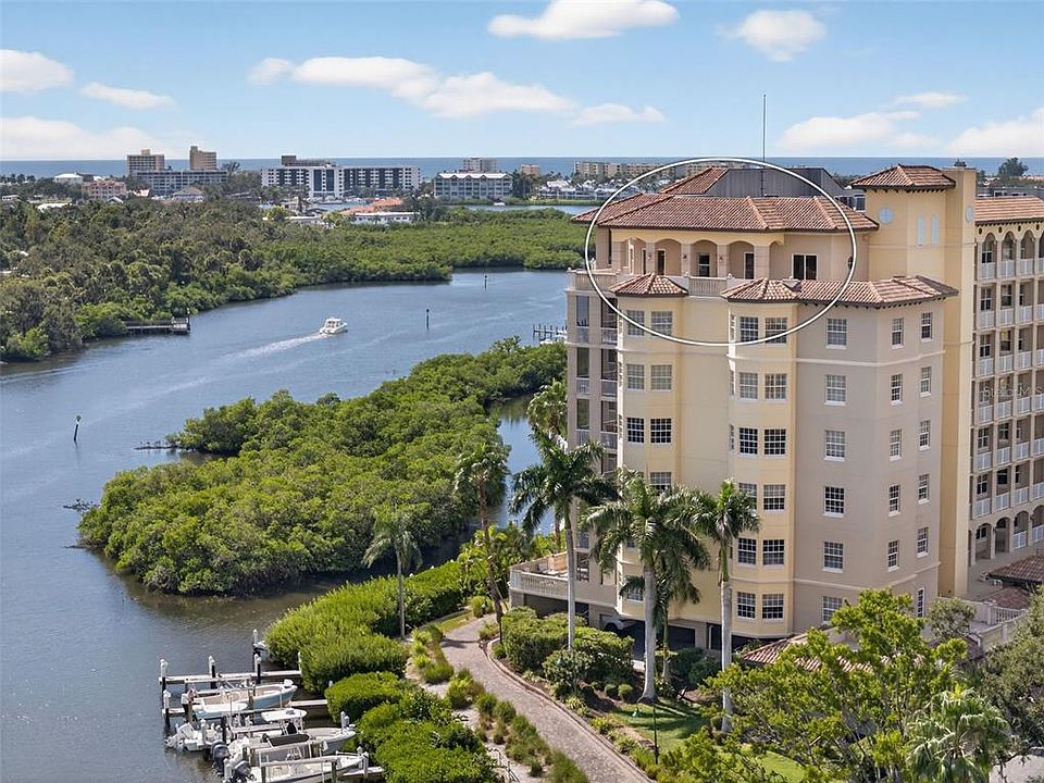 LUXURY PENTHOUSE WITH PRIVATE BOAT SLIP, OVER 1,000 SQFT TERRACE, and breathtaking views of the Downtown Sarasota skyline, Sarasota Bay, the Gulf, and Phillippi Creek! This one-of-a-kind residence truly defines coastal elegance and sophistication. Complete with an elevator that opens right into the unit, and 2-CAR GARAGE, this exclusive penthouse offers the ultimate combination of privacy, luxury, and convenience. Located directly on the Intercoastal water just minutes from the Gulf, you’re welcomed into this unit by 12-foot ceilings and an abundance of natural light streaming through the expansive windows, showcasing panoramic water and city views from nearly every room. The gourmet kitchen is a chef’s dream, featuring high-end KitchenAid appliances, granite countertops, an induction cooktop with hood, and beautiful custom cabinetry. Adjacent to the kitchen, a cozy dining area offers the perfect spot for casual meals, while the open-concept living room is ideal for entertaining—all while taking in the incredible scenery. The spacious owner’s suite is a serene retreat, complete with access to a SECOND BALCONY/TERRACE, dual closets, and a spa-like bathroom with a walk-in shower, soaking tub, and dual vanities. The second and third bedrooms, located in the opposite wing for privacy, share a well-appointed bathroom—perfect for guests. The fourth versatile bedroom doubles as an office or den, with a full bathroom conveniently nearby. Step outside to the expansive 1,000+sqft terrace—a rare feature in Sarasota—where you can unwind, dine, and entertain while enjoying the magnificent views after a day out on the water from your PRIVATE BOAT SLIP. Additionally, hurricane windows and doors offer peace of mind. Just a short stroll away, the gated community amenities include a heated pool and spa, fitness center, clubhouse with catering kitchen and bar area, kayak launch, and a dog park, all nestled within a secure and beautifully maintained waterfront setting. Opportunities like this are extraordinarily rare in Sarasota—a true penthouse lifestyle offering unmatched outdoor space, panoramic views, and private boating access all in one luxurious package.