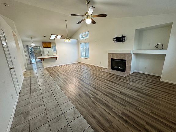 - The living and dining room are combined, featuring a wood-burning fireplace,