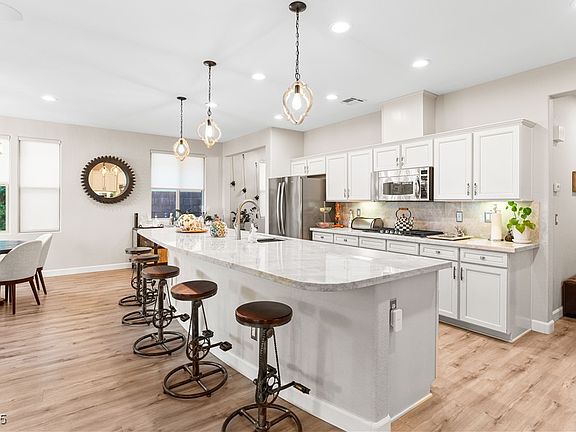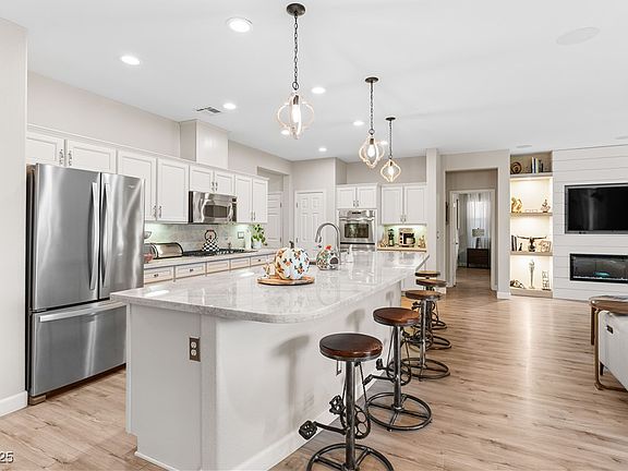 Summerlin South – Amado Crest Village! They say location is everything in real estate! Nestled in the foothills among million-dollar homes, this professionally designed and fully remodeled single story (late 2021) blends luxury, comfort, and style. Step inside to discover white oak luxury plank vinyl flooring, soaring 9’ ceilings, open great room concept perfect for entertaining. The island kitchen showcases quartz counters, a full backsplash, stainless steel appliances, double oven, gas cooktop, white cabinetry, and custom pendant lighting. Statement wall, electric fireplace, built-in shelving, two-tone paint, upgraded fixtures, roller shades, 5” base moldings. 3 bedrooms, den/office, dual sinks, walk-in shower in the primary suite, laundry room w/cabinetry. Clean curb appeal w/stacked stone accents, gated courtyard, 3 covered patios, elevated lot. Paver fire pit, tranquil backyard! Located near community pool, parks, playground, golf courses, shopping and dining! Truly a Rare Find!