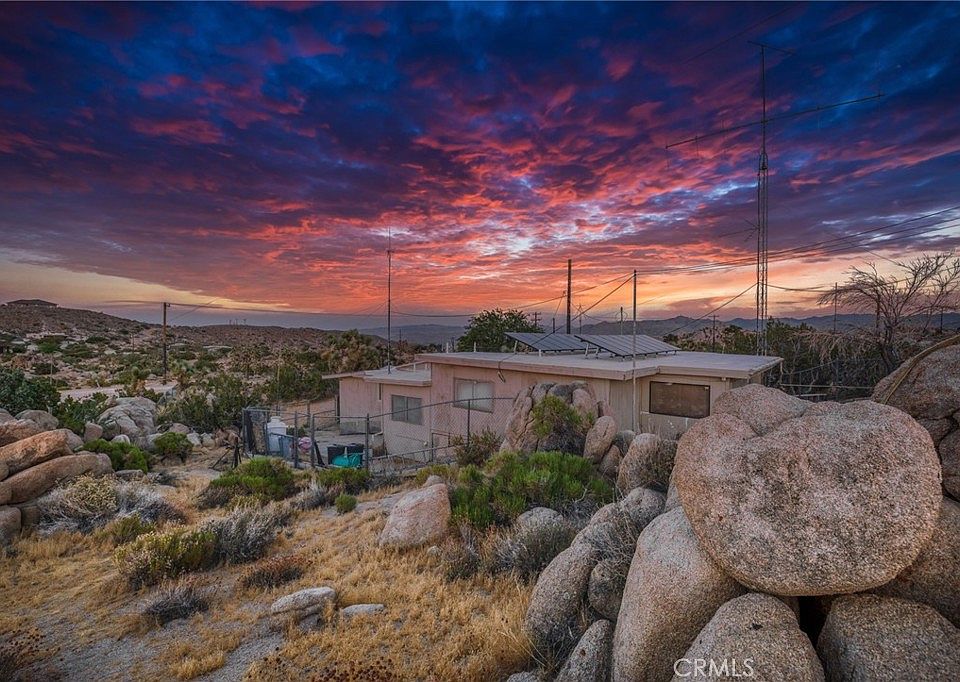 To appreciate this home, you would need to know the value of finding and having a home in the boulders. If you don't, then this property is not for you. These homes do not come up for sale very often. With this particular home you will need to have a vision of what the inside could look like with some TLC. The outside makes you feel like you are in a park. This home is nestled in the boulders, sits on a fully fenced 2.5 acres and the home itself cannot be seen from the road. It is a higher elevation than most homes in the area which gives you amazing 360 degree views. The boulders on the back side are approx 30 feet tall and besides being breathtaking, they actually give you a natural fire break (and maybe could be used to practice your rock climbing). There is an 8x12 observation deck for stargazing or just relaxing and room to build a deck up in the boulders. The garage is an enclosed carport which has an amazing 700 sq ft. of space. This home is conveniently located on a quiet cul de sac, is on public water and comes with a 16 panel solar system which is owned (yes, you are connected to the grid still). While it may sound like you are way out of town, you actually are not. It is just minutes to get back to the HWY or to head out to Joshua Tree National Park.
