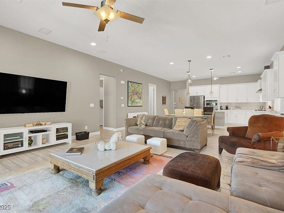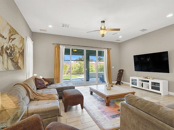 Beautifully Appointed And Highly Upgraded 4 Bedroom Single Story Former Model Home With Over $200,000 In Upgrades. Centrally Located With Easy Access To Schools, Shopping, Freeways, Raiders Stadium, And The World-Class Entertainment Of The Las Vegas Strip. Open Floor Plan Features An Oversized Family Room With Center Slider Leading To A Private Backyard Oasis With Fire Pit And Remote-Controlled Patio Shades. Chef's Kitchen Includes Waterfall Quartz Countertops, Flat Panel Shaker Cabinets, GE Café Appliances, And Oversized Island Perfect For Entertaining Family and Friends. Spacious Primary Suite Offers Spa-Like Bath And Custom Walk-In Closets. Three Additional Bedrooms With Walk-In Closets and Upgraded Light Fixtures. Upgrades Include Full Alarm System With Motion Sensors, Surround Sound In Living Room And Primary Bedroom, EV Charging In Garage, Tankless Water Heater, Covered Entry, Custom Paint, Fixtures, And Flooring. This Impressive Home Blends Comfort, Luxury, And Location.