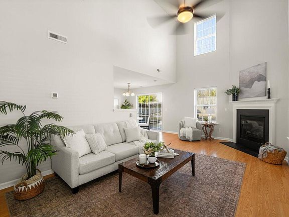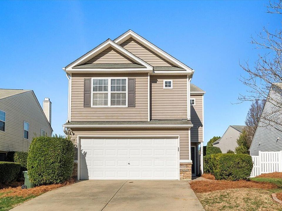 Soaring two-story ceilings and upper windows create a bright, open living space filled with natural light in this charming 3-bedroom, 2.5-bath single-family home in Raleigh. The main level offers an inviting layout anchored by a cozy corner fireplace with gas logs, perfect for everyday living or entertaining. The cheery kitchen/dining combo features ample cabinetry, an L-shaped peninsula ideal for counter-height seating, a pantry, and easy flow to the main living areas. Large glass sliders open to a fully fenced backyard with a wooden patio, extending the living space outdoors. All bedrooms are located upstairs, including a spacious primary suite with a walk-in closet and an updated en-suite bath with designer wallpaper. Two additional bedrooms share a full hallway bath with a tub/shower combination. An updated half bath on the main floor adds convenience. The HOA maintains the front yard, including grass cutting, annual pine straw refresh, aeration/seeding as needed, and bush trimming. Residents also have the option to join the Harrington Grove Pool. With its light-filled interiors, thoughtful layout, and private outdoor space, this home offers comfort, style, and easy living in a desirable Raleigh location.